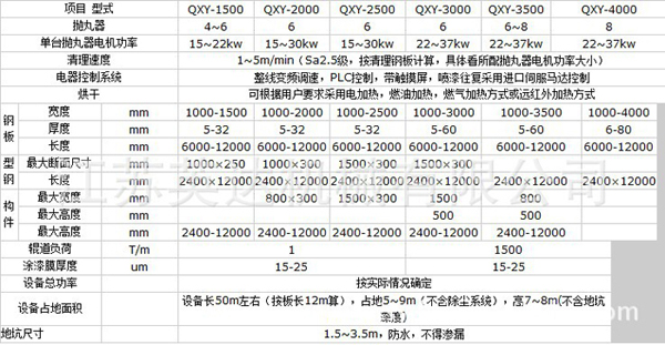 QXY鋼板預處理線主要部件由清理室,輥道輸送機、拋丸器、彈丸循環(huán)系統(tǒng)(含提升機、分離器、縱向螺旋輸送器和供丸管道)、除塵、清掃、電氣控制等部件組成。