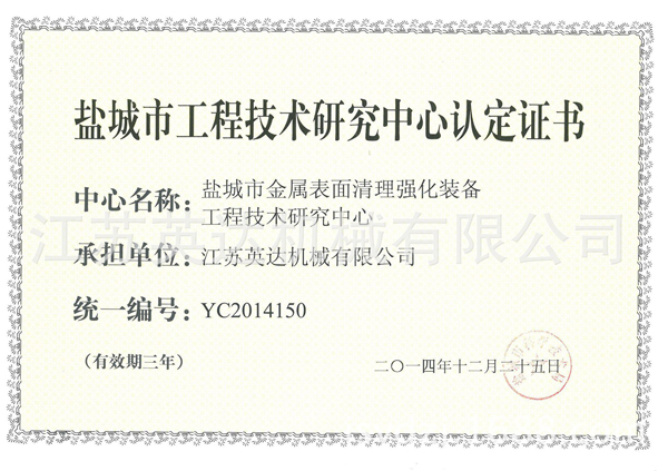 公司率先通過ISO9001:2008質(zhì)量管理體系認(rèn)證、ISO14001:2004環(huán)境管理體系認(rèn)證。擁有一支專業(yè)的技術(shù)團(tuán)隊(duì),先后取得了網(wǎng)帶通過式拋丸機(jī)、新型機(jī)械回收噴砂房、輥道通過式重鋼拋丸機(jī)等三十項(xiàng)產(chǎn)品專利。(注:各項(xiàng)產(chǎn)品專利及所有證書詳見企業(yè)官網(wǎng):http://www.ch775.com/或阿里誠信檔案)